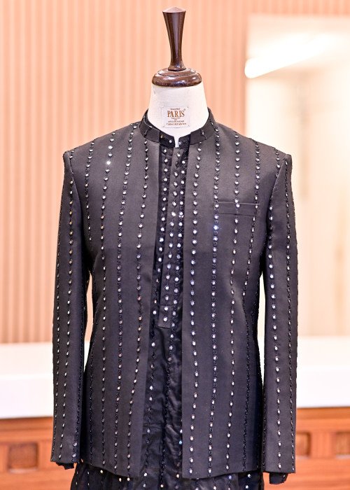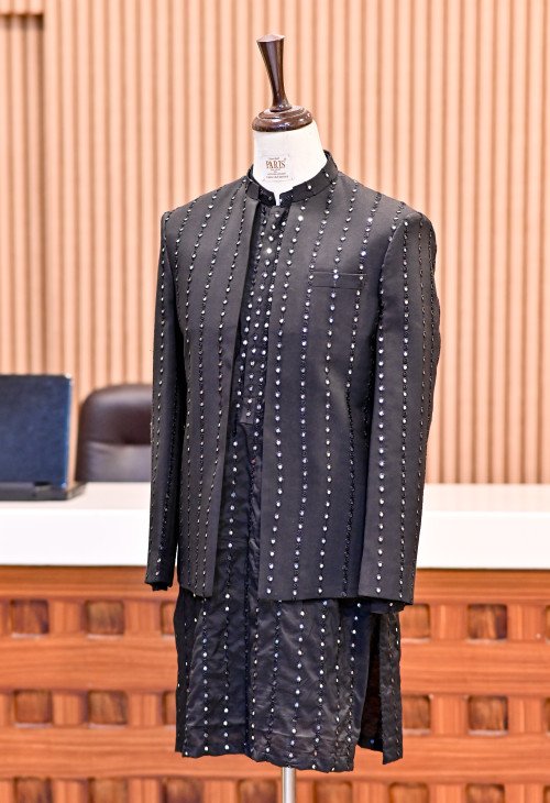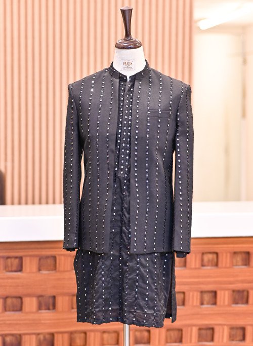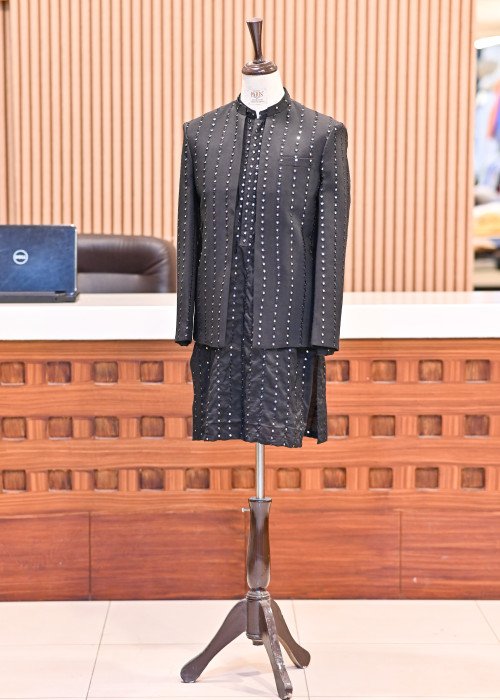 Be the first to review Black Prince Coat with Mirror Work Paired with Matching Kurta and Simple Trousers