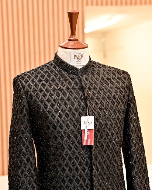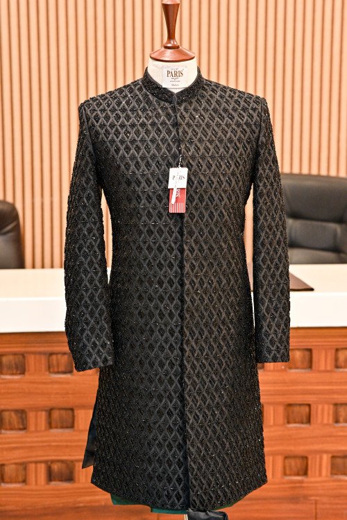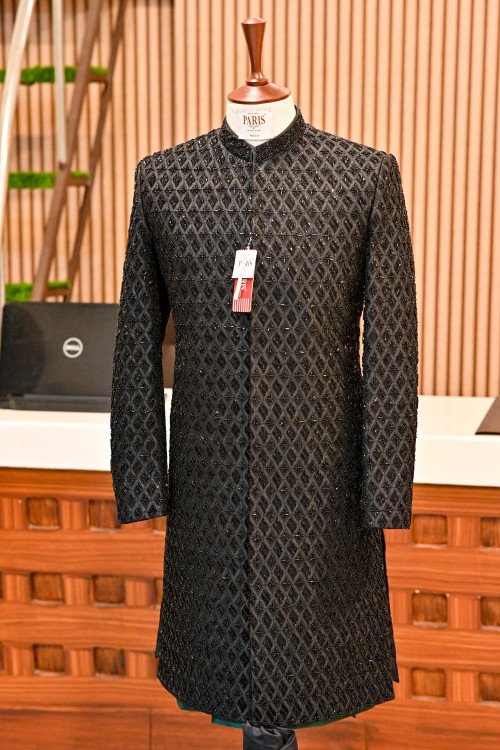 Elevate your royal look with this timeless black sherwani, crafted from premium fabric.Adorned with intricate full hand embroidery for a luxurious finish.A perfect blend of traditional charm and modern sophistication.Ideal for weddings, receptions, and grand festive occasions.