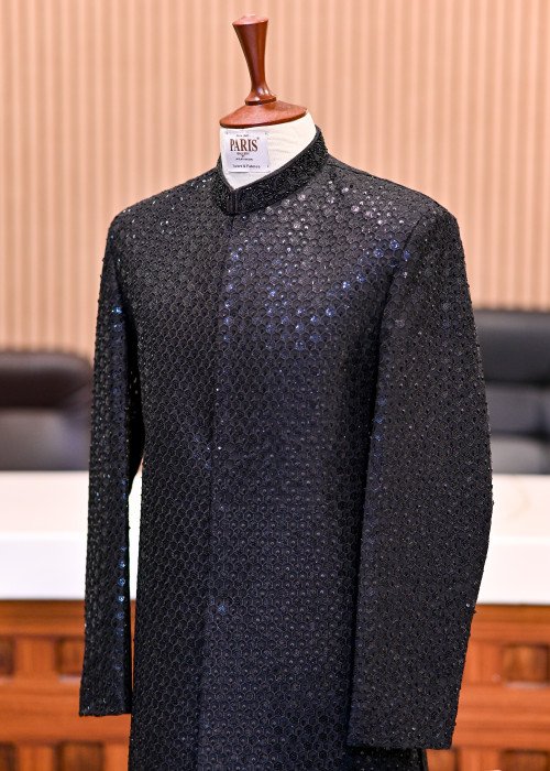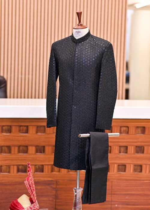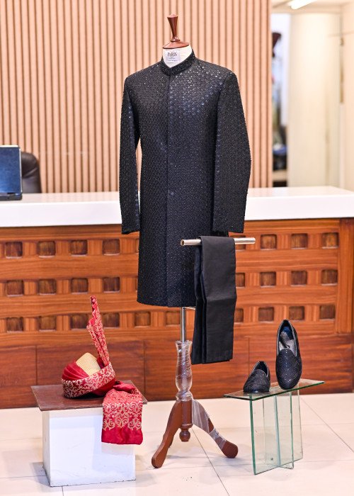 Classic black sherwani enriched with premium embroidery and fine handwork.Complete set includes matching shoes, kulla, and trouser for a royal finish.Tailored with precision to deliver style, comfort, and elegance.Perfect attire for grooms, receptions, and grand festive occasions.