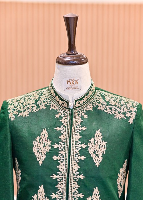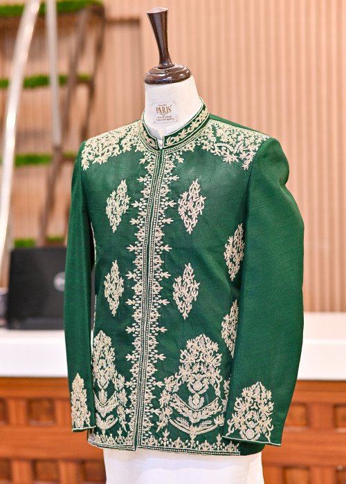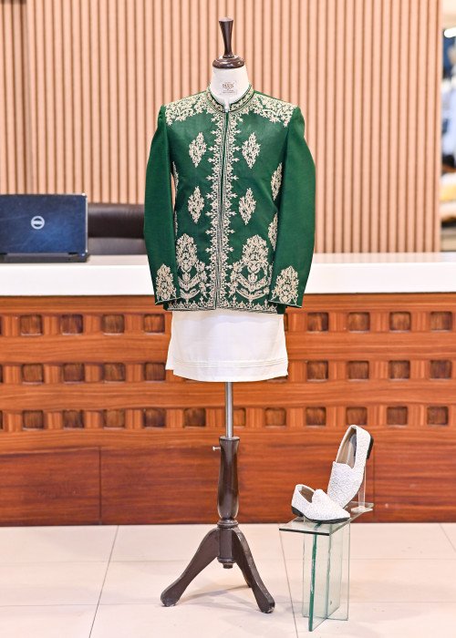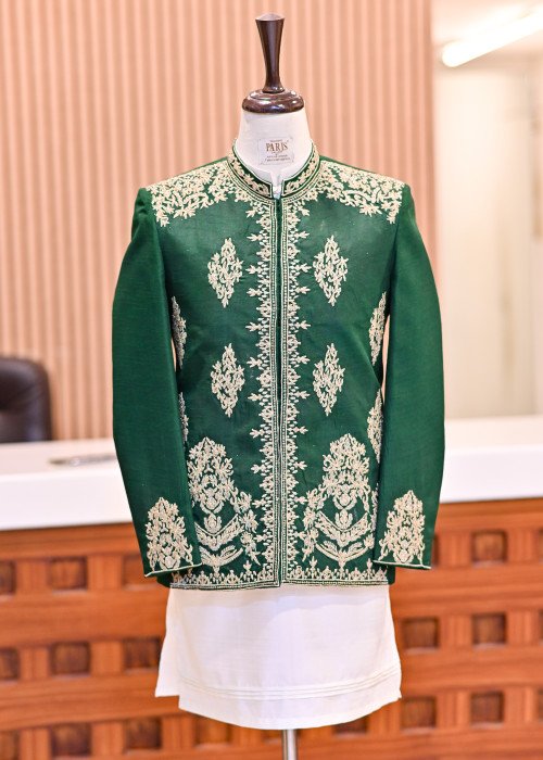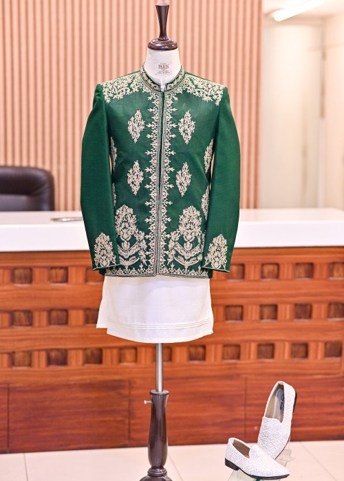 Elevate your traditional style with this dark gray-green prince coat, highlighted by elegant embroidery work. Paired with a matching kurta, simple trousers, and coordinating shoes, it creates a complete and graceful ensemble. Perfect for weddings, festive events, and formal gatherings, this outfit blends sophistication with timeless tradition. A versatile choice for men who value refined fashion.