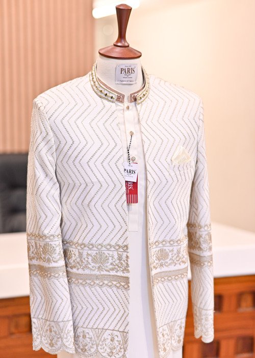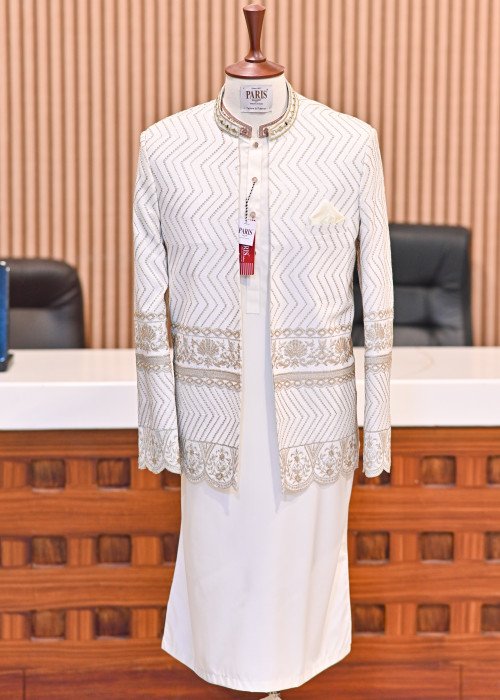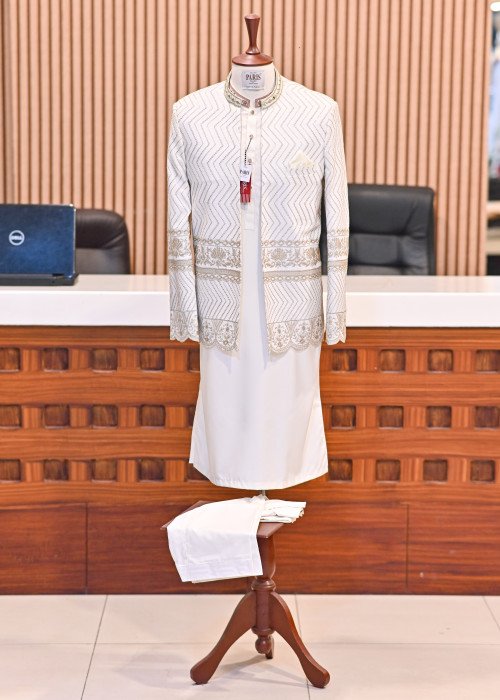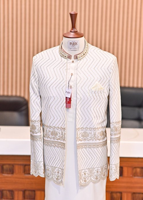 Step into timeless sophistication with this premium quality prince coat.Designed with fine embroidery for a regal and refined look.Perfectly paired with a crisp white kurta and tailored trouser.Ideal for weddings, festive occasions, or grand celebrations.