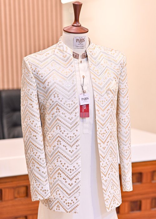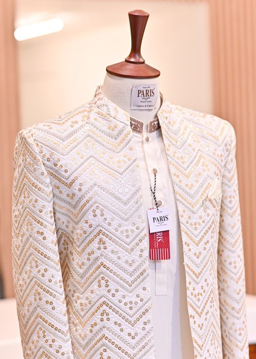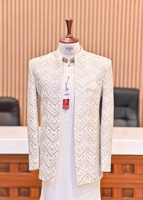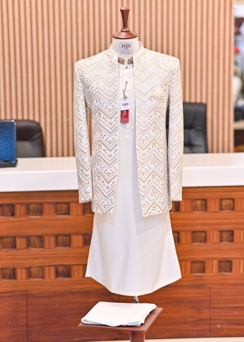 Graceful white prince coat adorned with fine embroidery.Paired with a matching kurta and trouser for a complete look.A perfect blend of elegance, tradition, and sophistication.Ideal for weddings, receptions, and festive gatherings.
